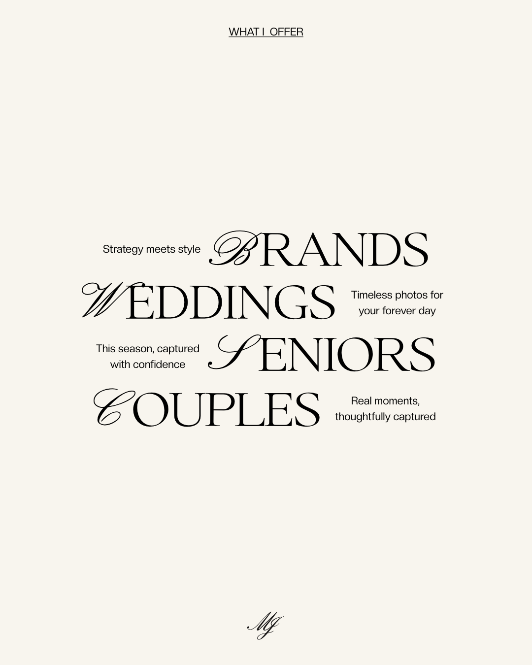 This branding and web design for Madeleine Johnson Photography conveys a timeless, editorial feel with its refined typography and clean layouts. The neutral palette and elegant use of script fonts highlight her professionalism while letting the photography take center stage. The overall aesthetic balances sophistication with warmth, creating a brand that feels both elevated and approachable.